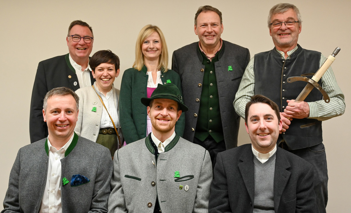 (vordere Reihe von links) Oberbürgermeister Dr. Christian Hümmer, Vorstand Simon Schreiber, Stadtpfarrer Konrad Roider (hintere Reihe von links) Schriftführer und Altoberbürgermeister Manfred Kösterke, zweite Schatzmeisterin Teresa Hain, erste Schatzmeisterin Andrea Maier, zweiter Vorstand Martin Schweiger, Schwerttanzmeister Karl Weilharter